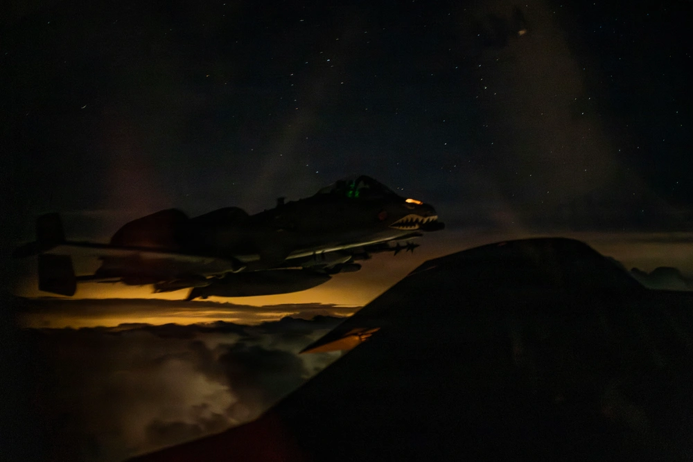 Un aereo A-10 Thunderbolt II della US Air Force vola accanto a un aereo KC-135 Stratotanker sopra l’area di responsabilità del Comando Centrale degli Stati Uniti durante l’operazione Epic Fury, 9 marzo 2026. (Foto della US Air Force)