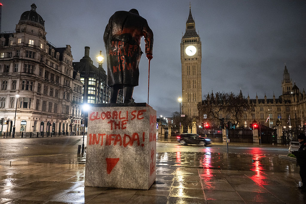 La statua di Winston Churchill fuori dal Parlamento britannico, l’organo legislativo nazionale che la sua personalità ha dominato per 40 anni come membro, ministro del governo e due volte Primo Ministro, è stata vandalizzata durante la notte. La statua e il piedistallo erano dipinti con messaggi in rosso, tra cui “criminale di guerra sionista”, “Palestina libera”, “fermare il genocidio”, “globalizzare l’Intifada” e “mai più adesso”.