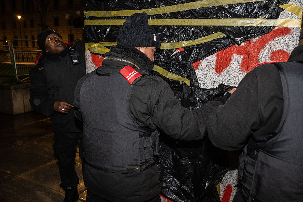 Dopo che l’atto vandalico è stato scoperto, i dipendenti del Consiglio di Westminster hanno avvolto la statua in plastica nera. Successivamente, una squadra di professionisti della pulizia del patrimonio ha iniziato a rimuovere la vernice.