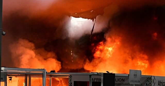 Questa schermata tratta dalle riprese video di AFPTV mostra le squadre di emergenza che combattono un incendio scoppiato in un padiglione all’interno della sede della conferenza delle Nazioni Unite sui cambiamenti climatici COP30 a Belem, nello stato di Para, in Brasile, il 20 novembre 2025. Si può vedere del fumo nero mentre inghiotte il corridoio e sale nell’atmosfera. (AFPTV/AFP tramite Getty Images)
