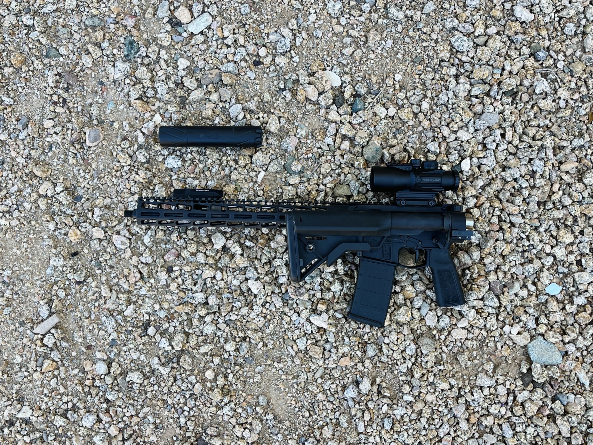 Il fucile ha un paramano Shield Arms 15″ M-LOK, al quale abbiamo attaccato una luce INFORCE WILD2. Per quanto riguarda l’ottica, abbiamo inserito un cannocchiale Primary Arms SLx Prism, che offre la possibilità di mirare a distanza abbinato a un reticolo illuminato al centro per i quarti ravvicinati.
