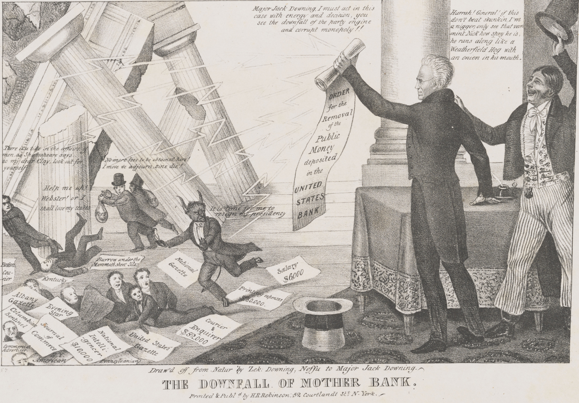 Una vignetta litografica del 1833 che mostra il presidente Andrew Jackson che distrugge la Seconda Banca degli Stati Uniti con il suo “Avviso di rimozione”. Litografia di Zachariah Downing, pubblicata da Henry R. Robinson. (Biblioteca del Congresso tramite Wikimedia Commons)
