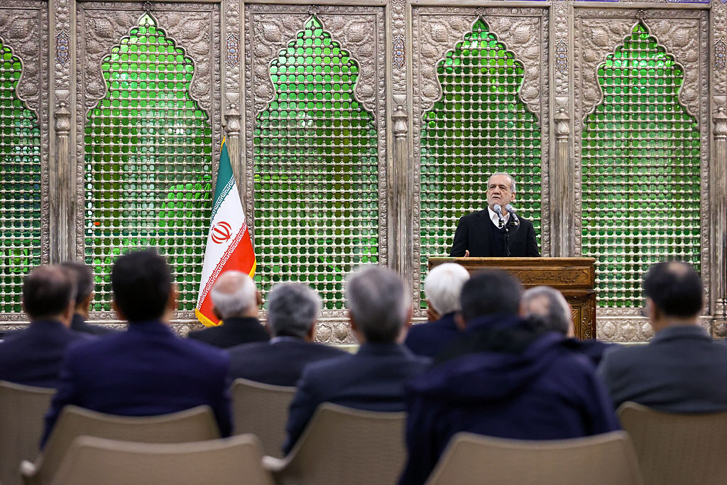 Il presidente iraniano Masoud Pezeshkian partecipa a una cerimonia tenutasi presso il mausoleo dell’Ayatollah Ruhollah Khomeini, fondatore della rivoluzione iraniana, nel sud di Teheran, in occasione del 47° anniversario della rivoluzione islamica iraniana il 31 gennaio 2026. (Presidenza iraniana/Handout/Anadolu tramite Getty)