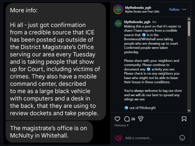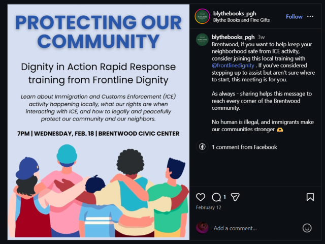 La proprietaria di Blythe Books, Lizzie McCoy, ha utilizzato la pagina Instagram del suo negozio per avvisare le persone quando gli agenti dell’Immigration and Customs Enforcement (ICE) degli Stati Uniti erano nella zona, Public Source di Pittsburgh segnalato Lunedi.