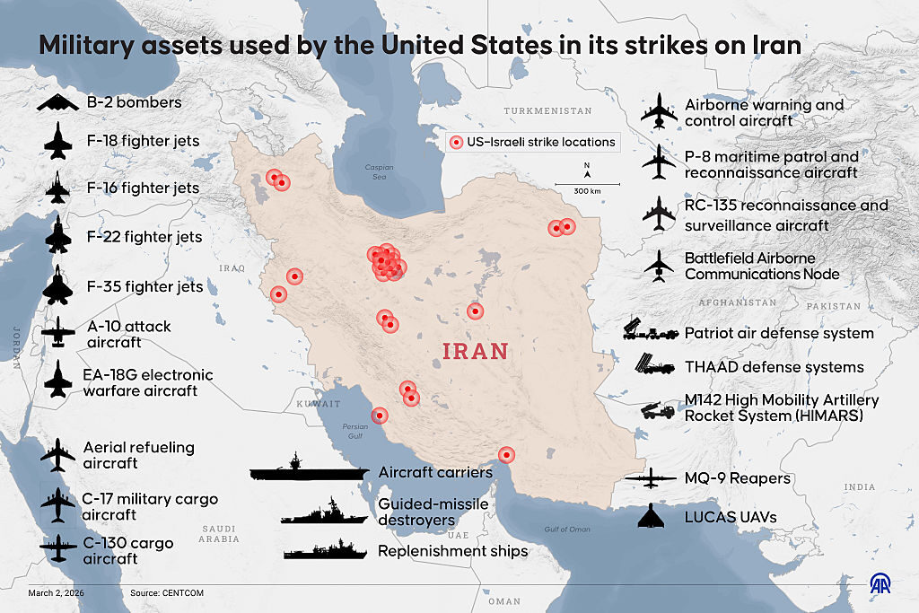 Un’infografica intitolata “Risorse militari utilizzate dagli Stati Uniti nei suoi attacchi all’Iran” creata ad Ankara, Turkiye, il 2 marzo 2026. (Foto di Murat Usubali/Anadolu tramite Getty Images)