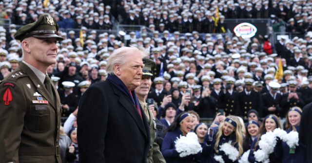 Il presidente Donald Trump ha ricevuto un benvenuto da eroe sabato alla partita di football Army-Navy allo stadio M&T Bank di Baltimora, dove ha lanciato la moneta per decidere il calcio d’inizio.